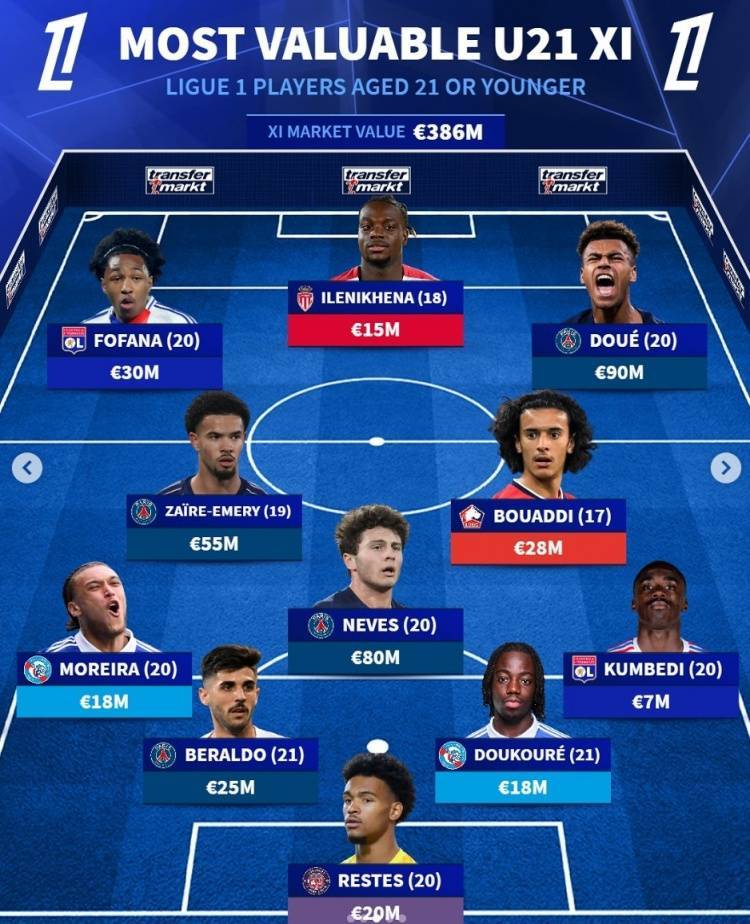 直播吧7月5日讯 《转会市场》统计了法甲U21球员最贵阵容,巴黎4将在列。