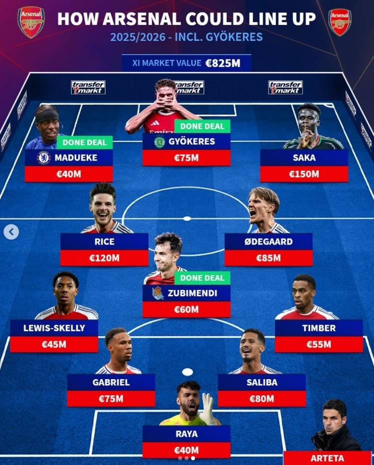 德国《转会市场》也给出了阿森纳2025-26赛季预期的主力阵容,这套阵容的总身价高达8.25亿欧。
